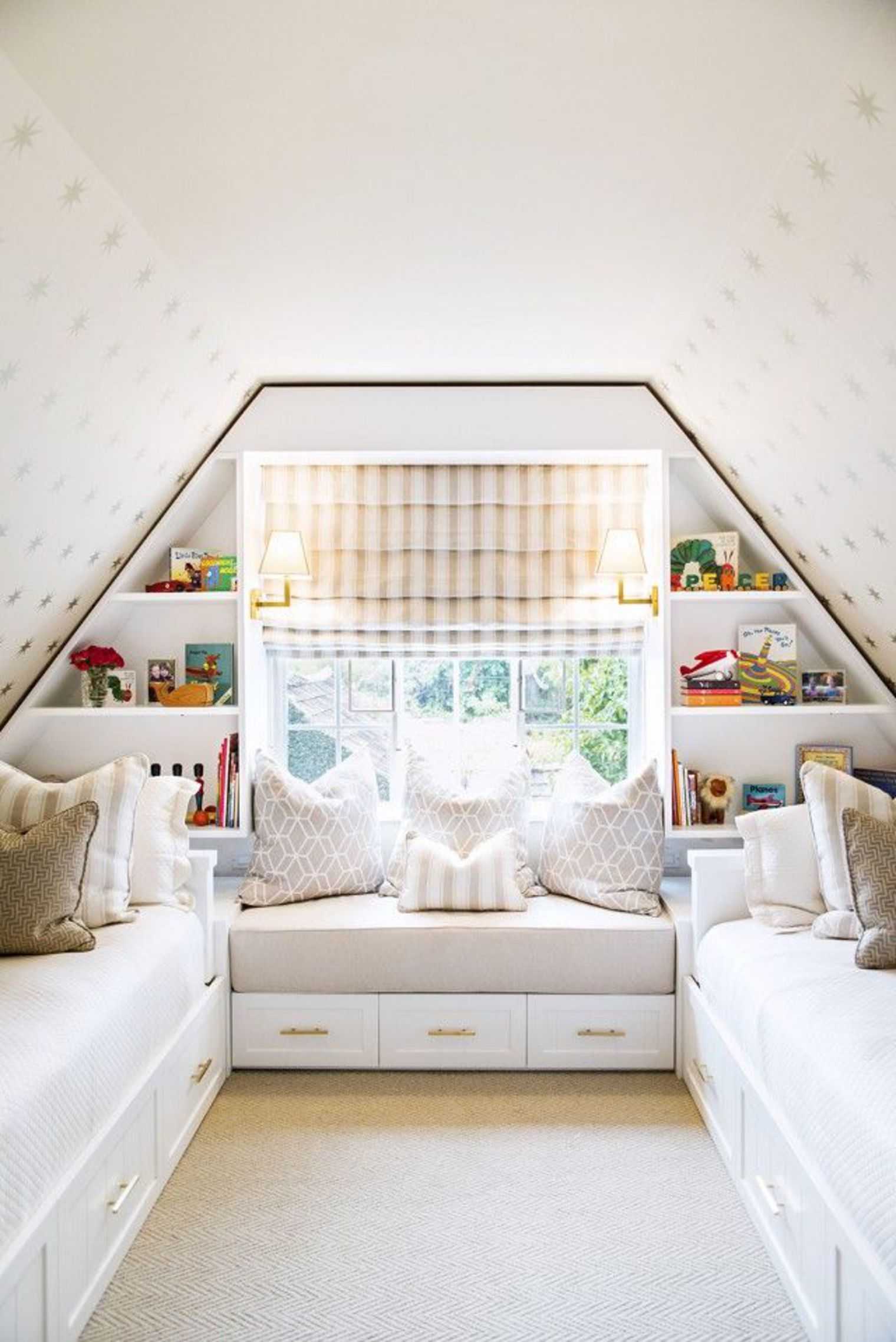 - спальные места находятся в ряд у длинной стены, отдельно друг от друга, угловая площадь возле окна оформляется в качестве функционального пространства для работы и творчества;