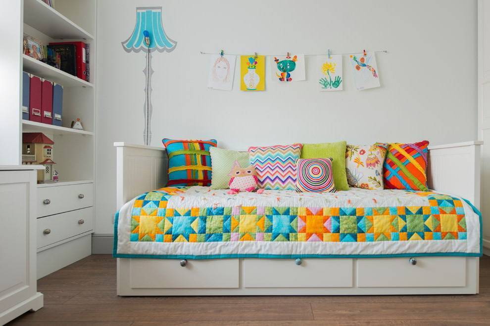 - Аксессуарами станут мягкие валики, игрушки, маленькие подушки, рисунки ребенка на стене, картинки в рамках.