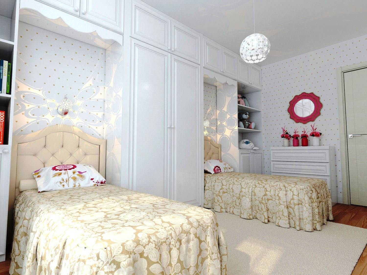 - кровати размещаются у противоположных стен, возле каждой обустраивается собственная рабочая зона со столом, комодом, шкафом и полками для книг или игрушек, аксессуаров;