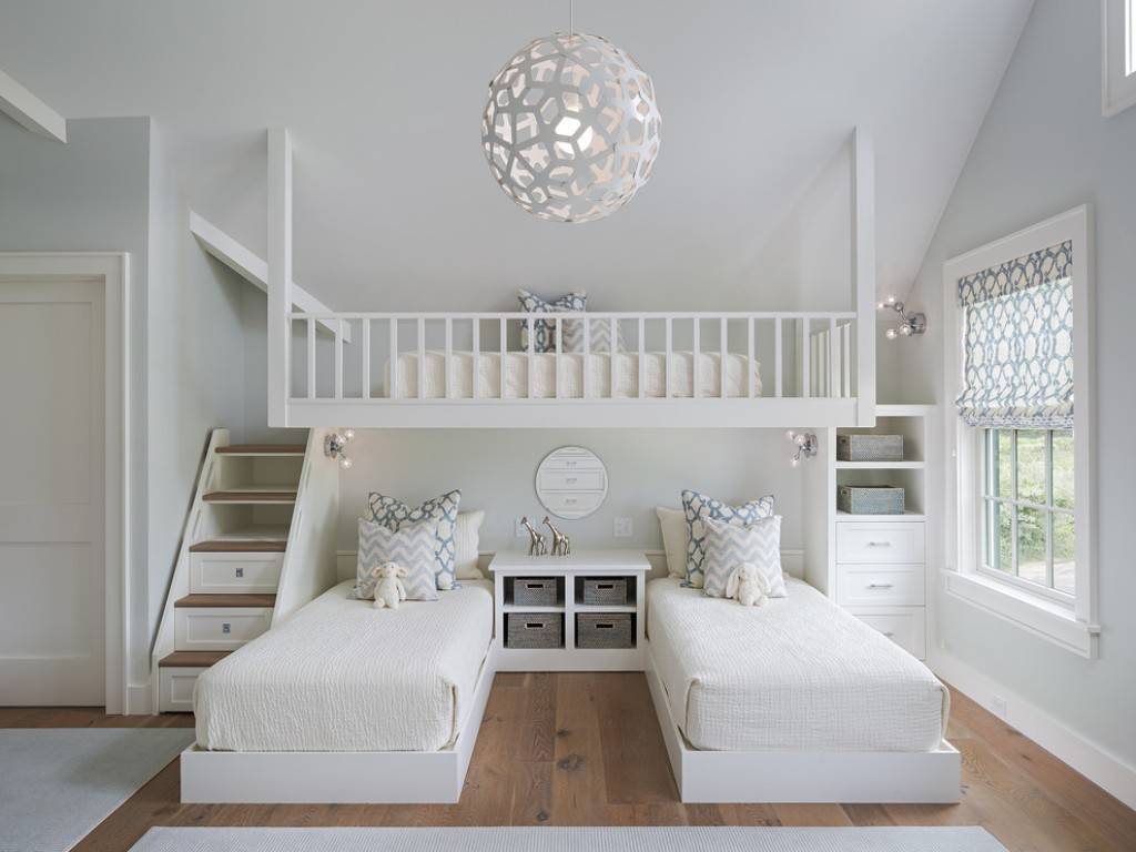 При организации детской для двух разнополых детей и юных жильцов с большой разницей в возрасте требуется деление комнаты на зоны в виде личного пространства для каждого из ребят и общей игровой/спортивной площади.