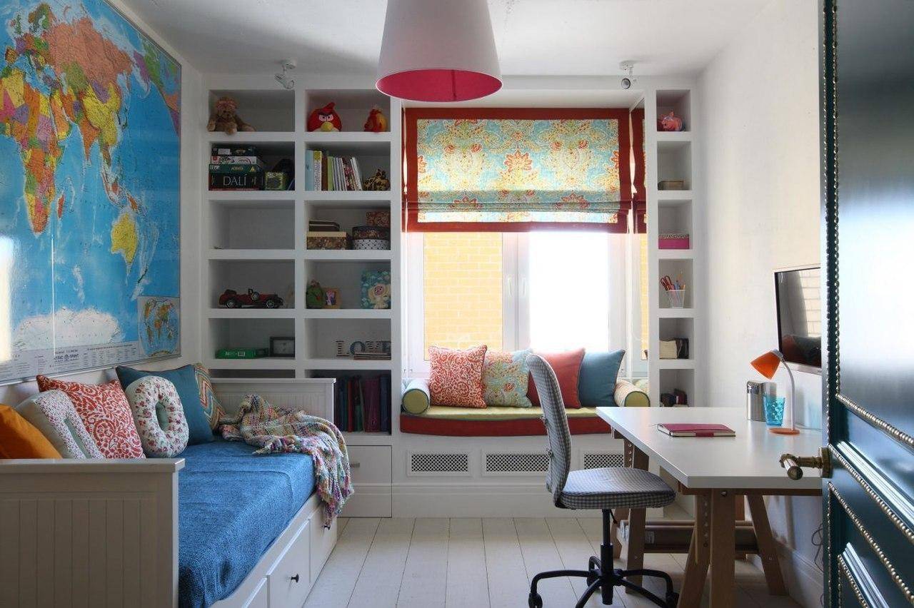 Прежде чем приступить к ремонту, можно рассмотреть и использование подоконника с наращенной столешницей вместо привычного варианта. Такая идея оригинальна и практична с точки зрения экономии пространства, поскольку позволяет организовать рабочую зону для двоих детей одновременно.