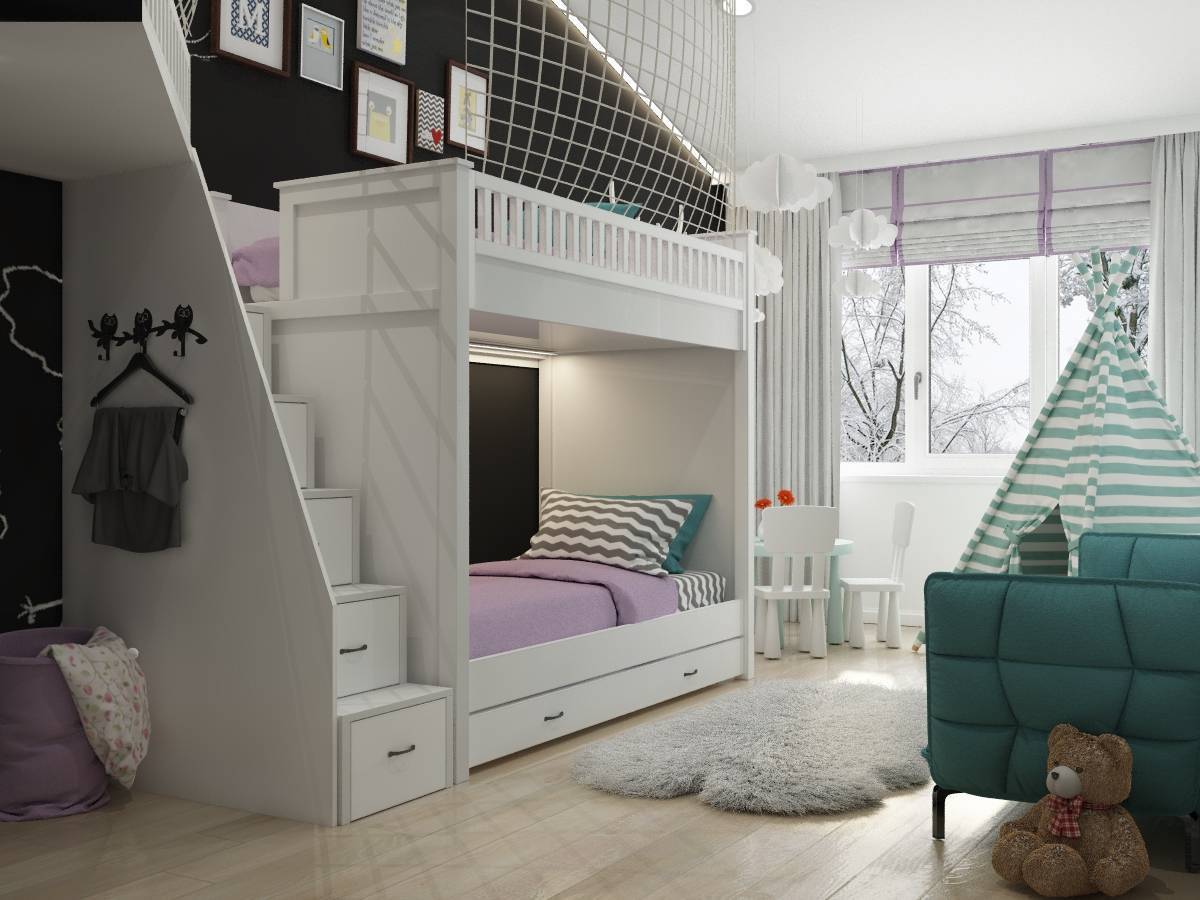 Кровать-чердак. Если позволяет пространство, то можно вместить два таких комплекса со спальным местом наверху и рабочим внизу. Этот вариант придется больше по душе для родителей разнополых деток. У каждого будет свое личное пространство. Таким образом, ремонт и грамотный подход к выбору мебели в хрущевку, даже для детей разного пола поможет создать комфортный уголок для каждого ребенка.