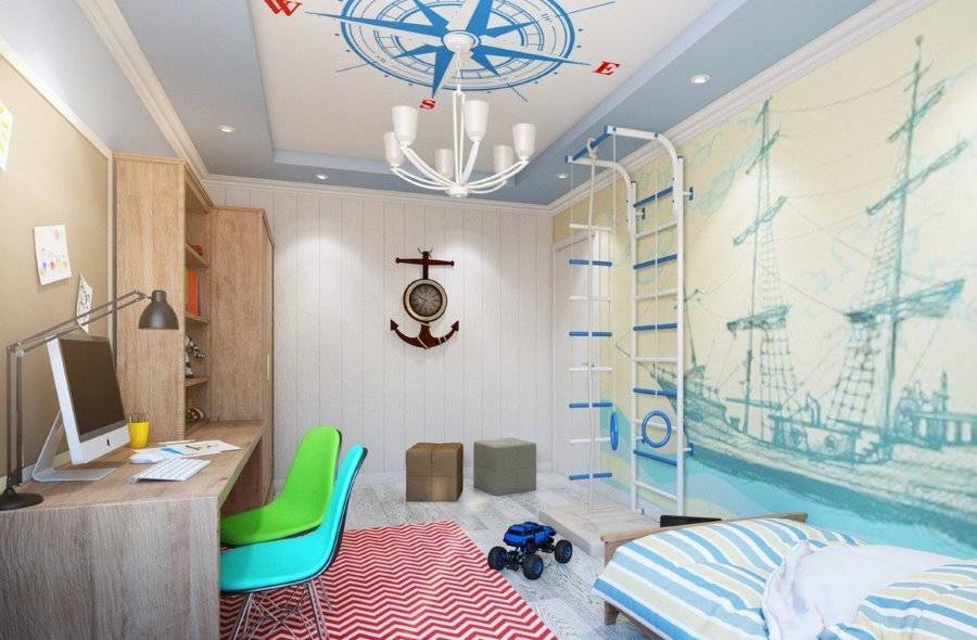 Если после ремонта у вас остался свободный уголок, то это отличное место для тренажера мальчика. Конечно, весь спортивный комплекс не вместится, но шведская стенка, брусья, турник или небольшая груша будут уместны. Для девочки же если есть место можно установить туалетный столик с зеркалом.