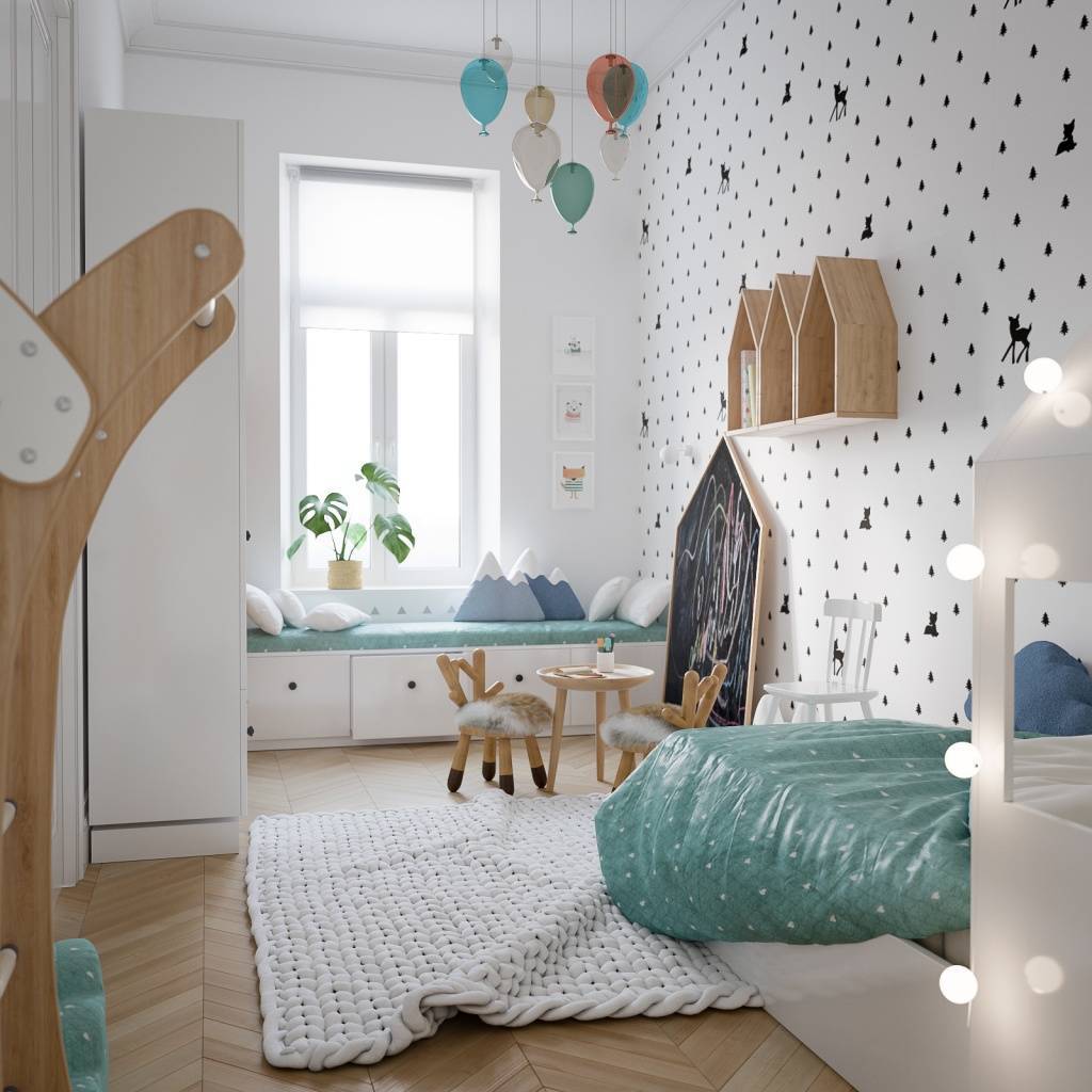 Уголок для ребенка может быть отделен от взрослого пространства детскими обоями с принтом в виде мультипликационных героев, сказочных персонажей, животных или игрушек. Можно выбрать и более нейтральные варианты, которые будут гармонично смотреться и на «взрослой» территории. Например, цветы, звезды, бабочки.