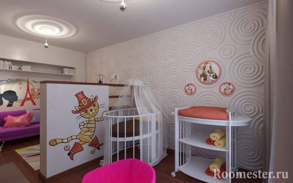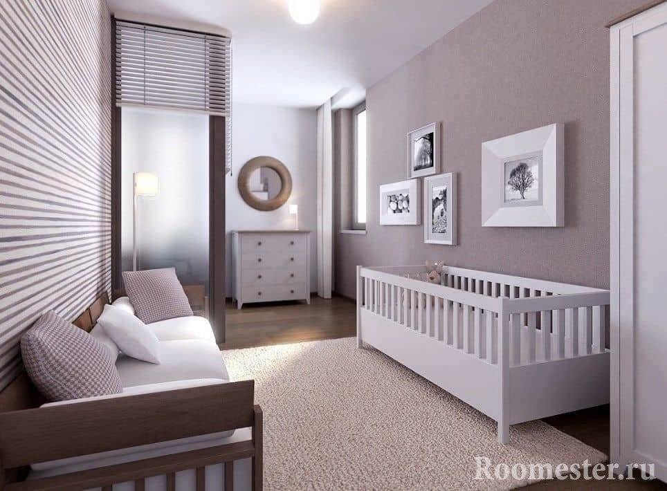 Грудной ребенок в отдельном помещении, по сути, не нуждается. Его зона обитания ограничена кроваткой и пеленальным столиком, которые мамы предпочитают устанавливать рядом с собственной кроватью.