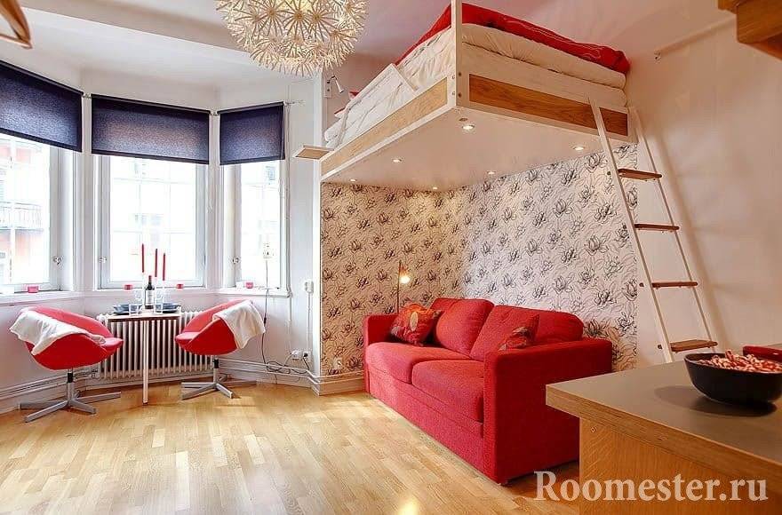 Интересное решение в дизайне маленьких квартир — обустройство дощатого возвышения в 80-100 см над полом. Свободное пространство под такой «сценой» удобно использовать для хранения зимней одежды, постельных принадлежностей, обуви, игрушек, колясок. Также под подиумом можно установить выдвижную кровать или спрятать туда любую другую трансформирующаяся мебель.