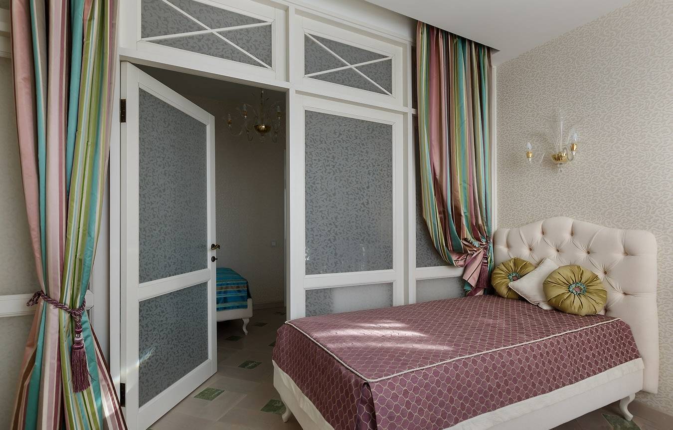 Двери-слайдеры отлично справятся с ролью тонкой перегородки. Полупрозрачные вставки, зеркала или витражи в них обеспечат доступ естественного освещения к родительской части комнаты, а также сделают ее визуально большей
