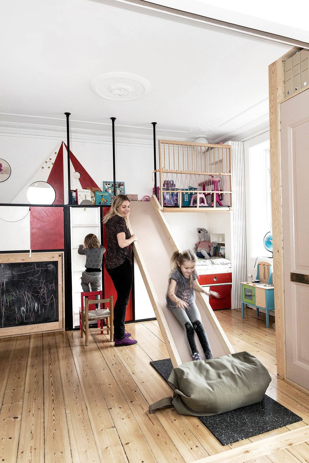 В детской зоне уместными будут фантазийные, красочные элементы. Девочкам понравится стилизованная мебель в виде дворца, кукольного театра, леса, всевозможные качели, гамаки, домики; мальчики же будут в восторге от машинок, космических и пиратских кораблей, спортивных лесенок, турников, подвесных колец. Если детей несколько, стоит постараться обустроить личный уголок для каждого. В условиях экономии площади для этого сгодятся двухъярусные, раскладные, выдвижные и трансформирующиеся конструкции.
