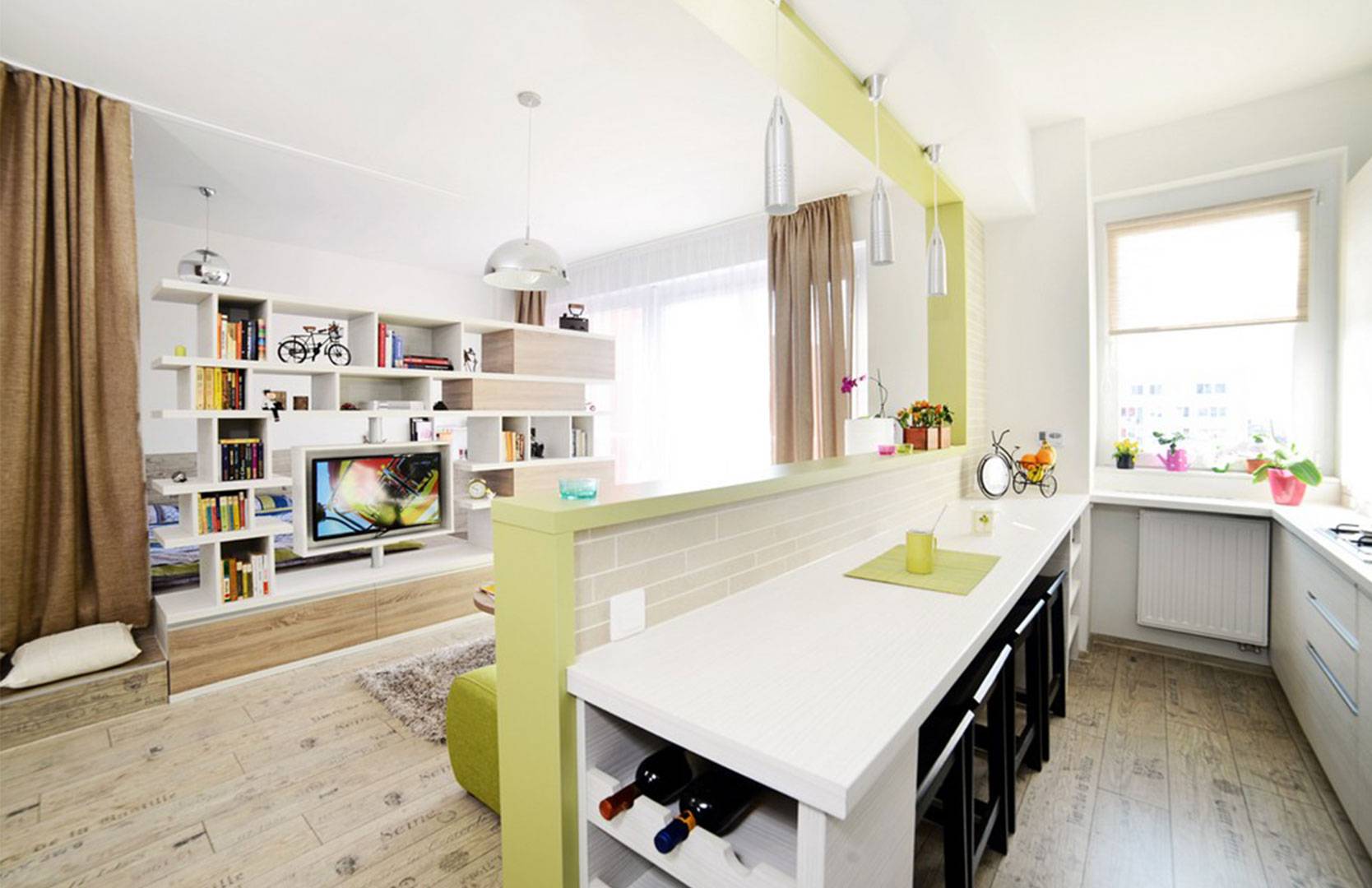 Если у тебя квартира-студия или обычная однокомнатная квартира, но ты можешь снести стену на кухню – это отличный способ выгодно обыграть каждый квадрат пространства.