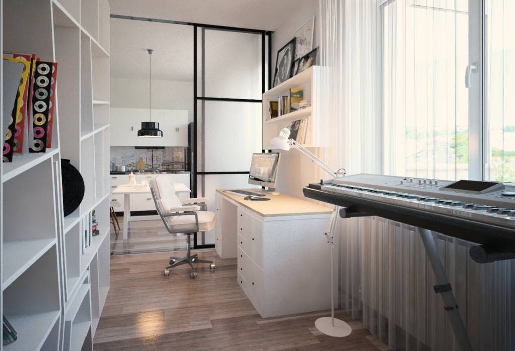 Элегантное и эргономичное решение – использовать столешницу-подоконник или стол-секретер, при необходимости трансформирующийся в шкаф. Еще один хороший совет для экономии пространства – если в процессе работы вам необходима работа с компьютером, приобретите ТВ-адаптер и избавьтесь от второго монитора в помещении.