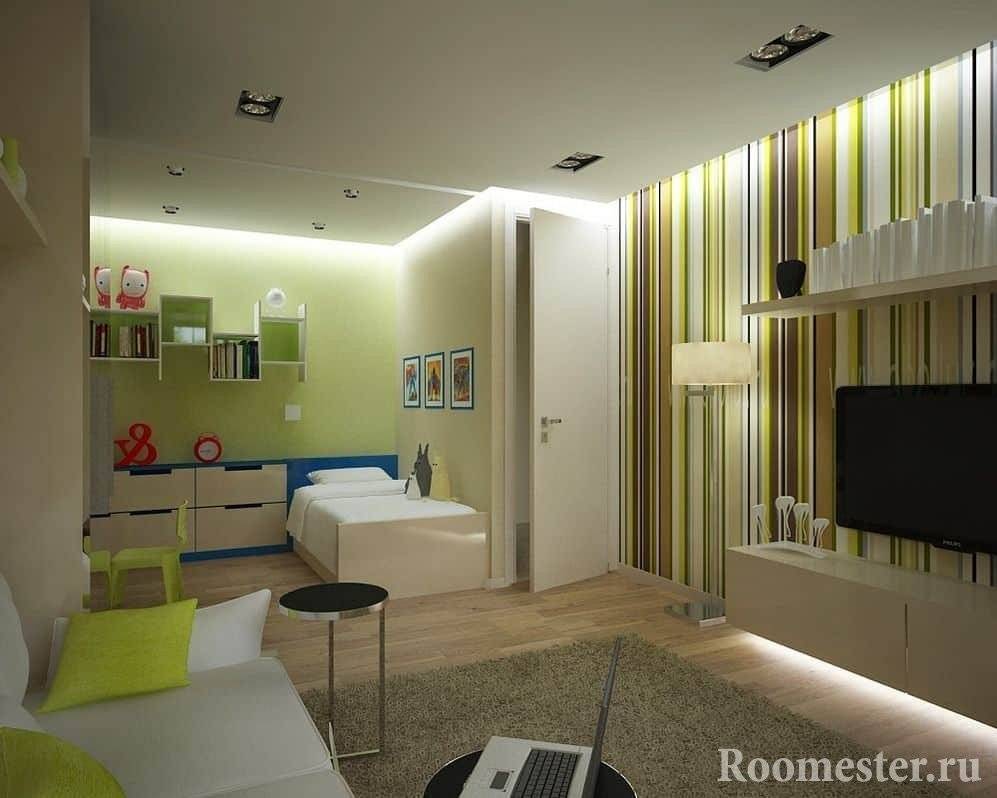 - Если размер, совмещённой с детской гостиной составляет не более 15-16 кв. м., то обустроить 2 полноценные комнаты невозможно. Следует выделить небольшой детский уголок с минимальным набором мебели. Если же помещение более 18 кв. м., то возможно применить зонирование. Его элементы можно применить и здесь.