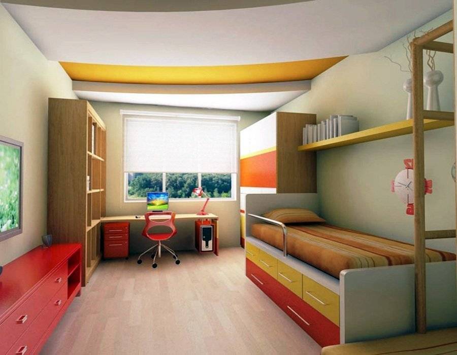 Для крохотной комнатки идеальным спальным местом можно считать односпальную кровать, совмещенную с рабочим столом и шкафчиком. Такая мебель обеспечит компактное хранение учебников, тетрадей, вещей. Она позволит проводить комфортный отдых. При невозможности покупки подобного изделия в качестве спального места может использоваться софа с внутренним отделением и подъемным механизмом. Внутри мебели можно хранить несезонные вещи и постельное белье. Дополнит тандем одностворчатый шкаф-купе с зеркальной дверцей. Он позволит легко проводить примерку вещей. Удобно хранить игрушки и книги поможет небольшой стеллаж. В качестве декора оптимально подойдут настенные украшения: картины, объемные фигуры (животных, людей, предметов). Пригодятся для декодирования и фанерные фигурки с подсветкой. Хорошо дополнить интерьер смогут тематические светильники. Это могут быть модели с крупными фигурками животных, людей.