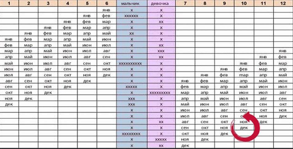 Таблица проста. Основана на том, что родившаяся в определенный месяц женщина сможет забеременеть мальчиком или девочкой, согласно этой таблице. Все просто, сопоставляете месяц рождения будущей мамы с месяцем предполагаемого зачатия. Статистика достоверности этого способа близится к 92%. Немножко математики, и вуаля, выбирайте месяц, в котором вероятность появления девчонки велика. Отнимаем 9 (срок беременности), и получаем время начала любовным утехам!!!