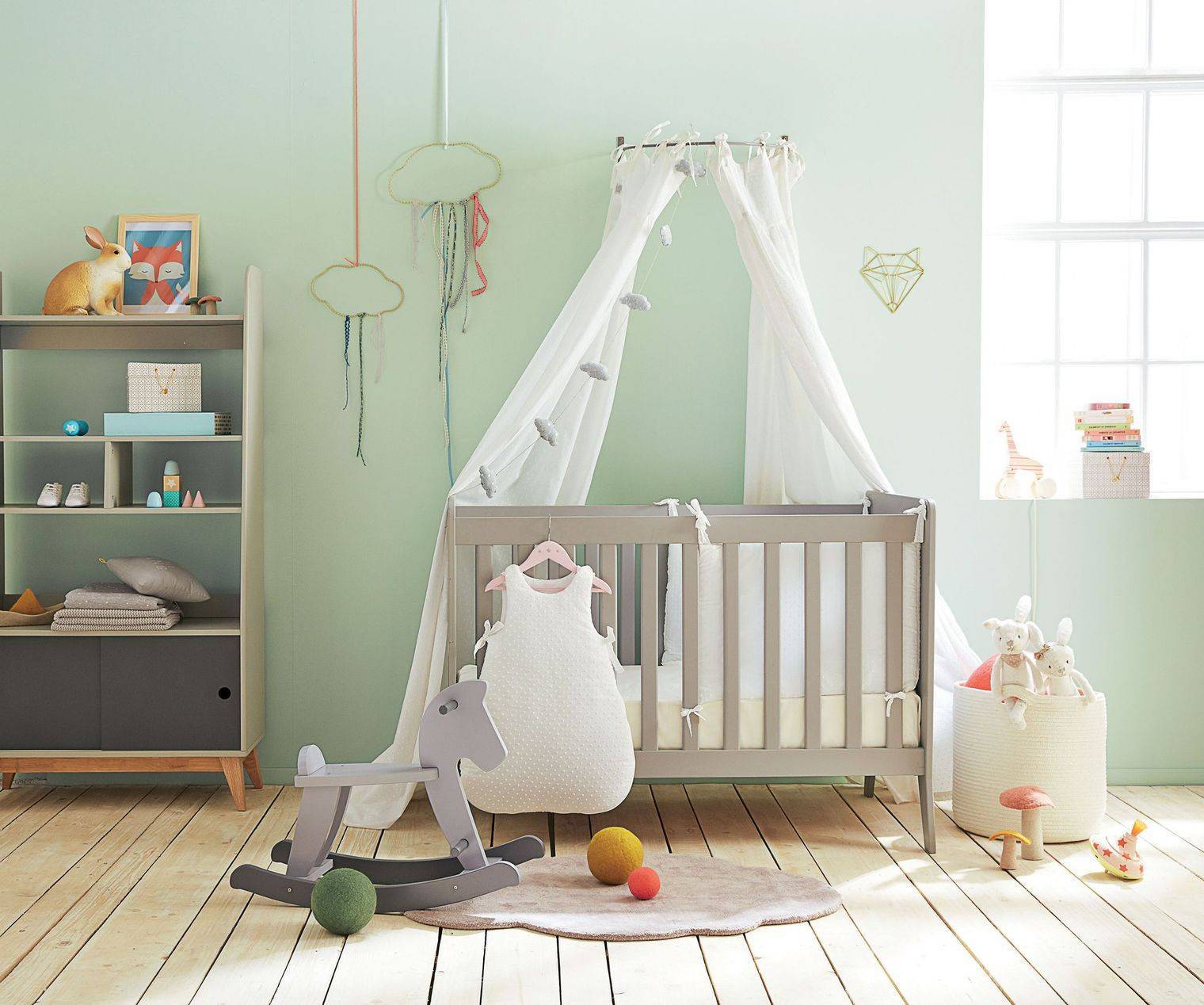 Кровать в интерьере комнаты для новорожденного не должна стоять возле двери или напротив окна. Рядом с кроваткой не должны находиться розетки, электроприборы, шнуры и другие мелкие или опасные для ребёнка предметы. Для кроватки, если есть возможность, можно соорудить подиум или прикрыть её балдахином. Балдахин поможет не только украсить спальное место, но и прикрыть малыша от солнечного света во время дневного сна.