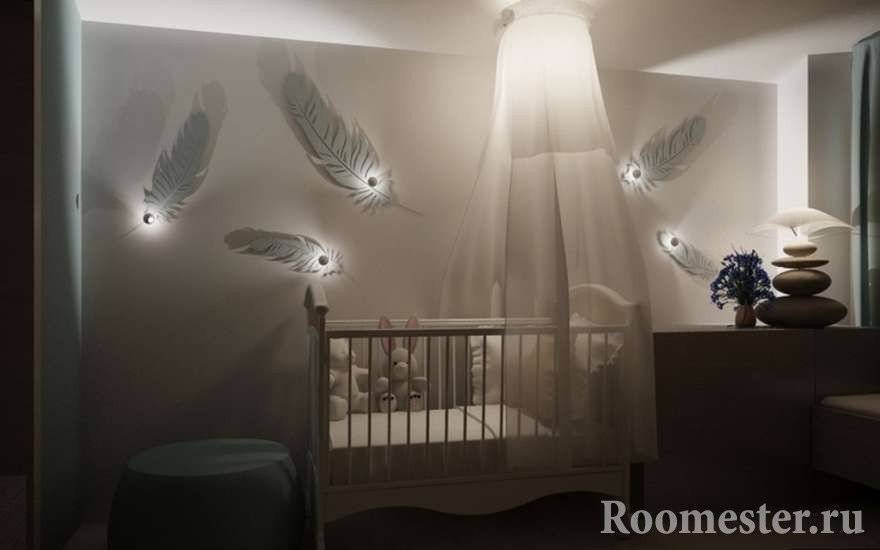 В интерьерах детских для младенцев, особое внимание должно уделяться актуальному вопросу ночных кормлений. В жизни матери и малыша это играет важную роль, поэтому в детской необходим мягкий свет, который не будет раздражать глаза малыша и может использоваться, как ночник