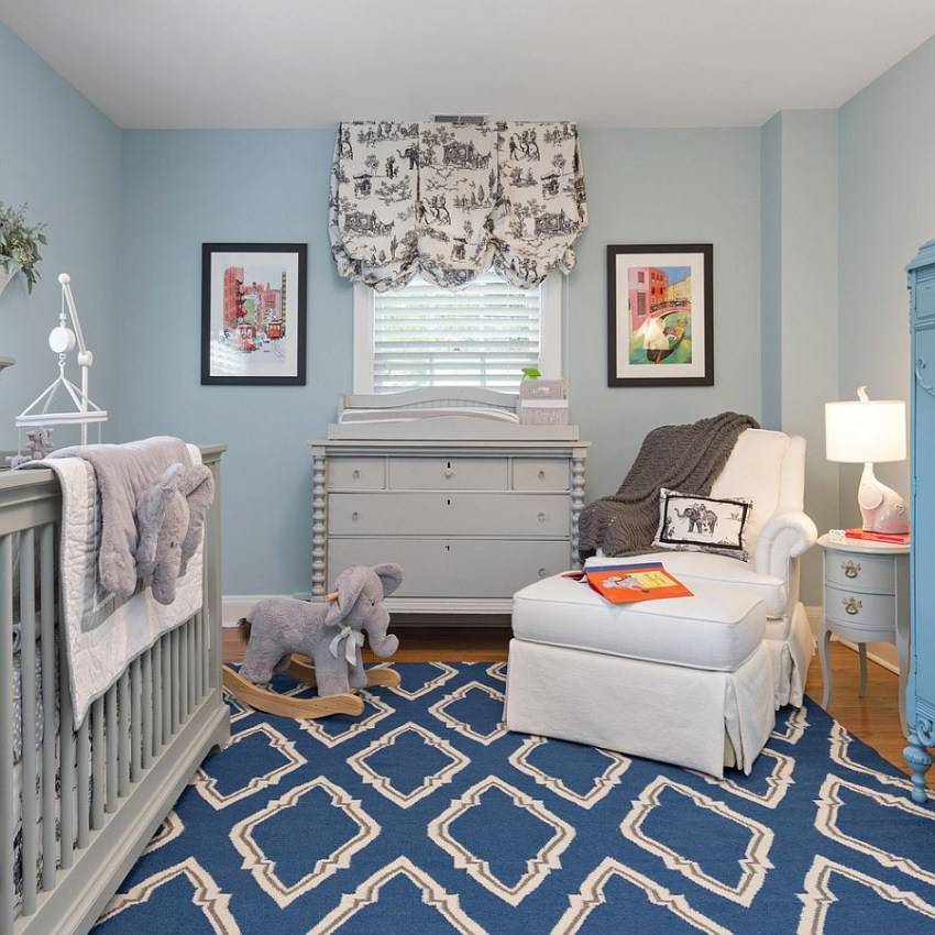 В комнате для новорожденного обязательны такие предметы как кресло – чтобы маме было удобно во время кормления малыша. Небольшой диван – маме тоже необходимо отдыхать днём. Ковёр и ящики для игрушек будут нужны только тогда, когда малыш уже начнёт ползать и играть.