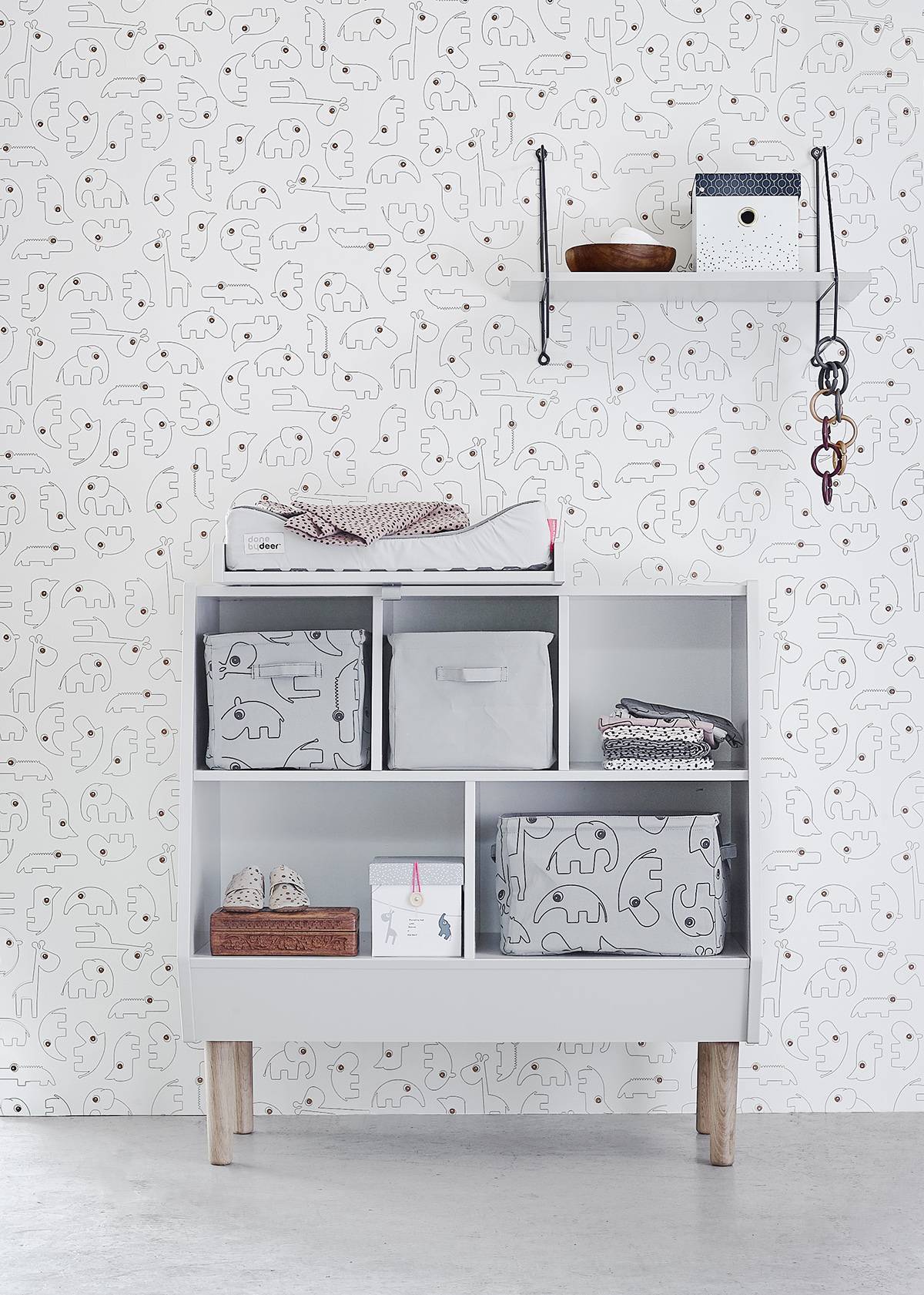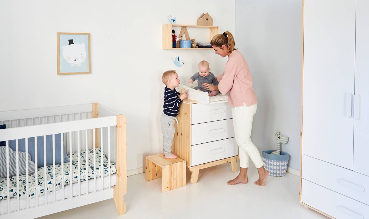 В магазинах для детских комнат продаются специальные гарнитуры мебели для новорожденных. В такие комплекты, кроме обычного шкафа, кроватки, прикроватной тумбочки, входят столик-комод (выполняющий роль пеленального столика и комода), стульчик для кормления. Современная мебель для новорожденных изготавливается лёгкой, модульной и мобильной. Её можно перекатывать (как кроватку на колёсах), можно моделировать и переделывать по необходимости, а можно переносить на новое место, освобождая пространство для игр.
