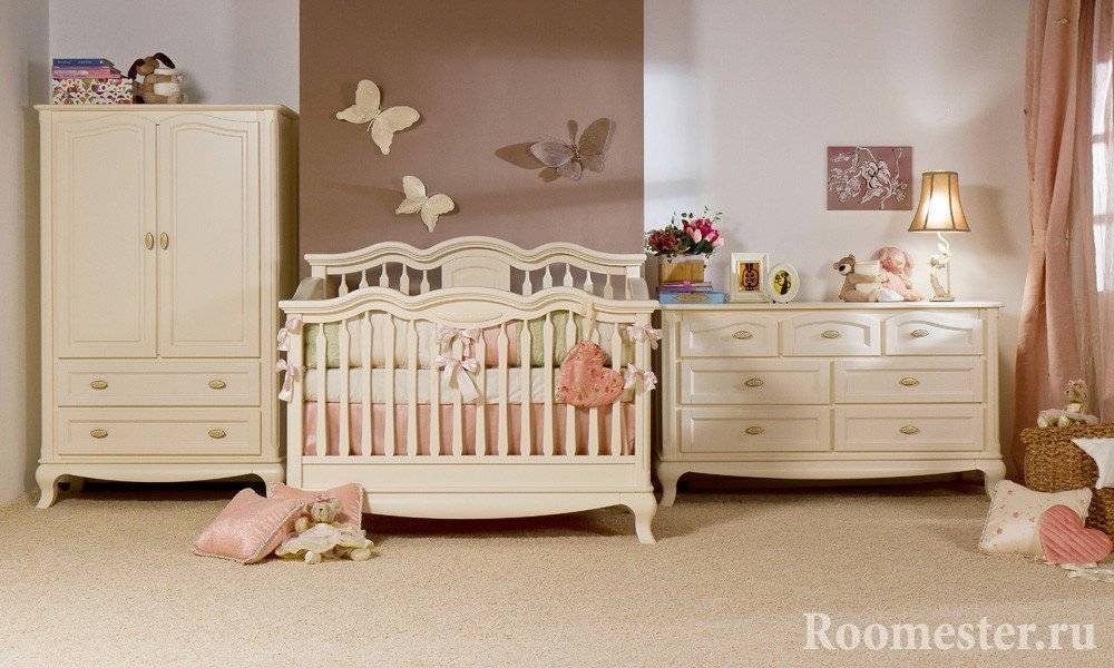 классический. Здесь применяются нежные кремовые оттенки, натуральный текстиль с воланами, оборками и рюшами. Мебель устанавливается деревянная с резьбой и другими декорами. При оформлении маленьких пространств предпочтение отдается легким и воздушным тонам.