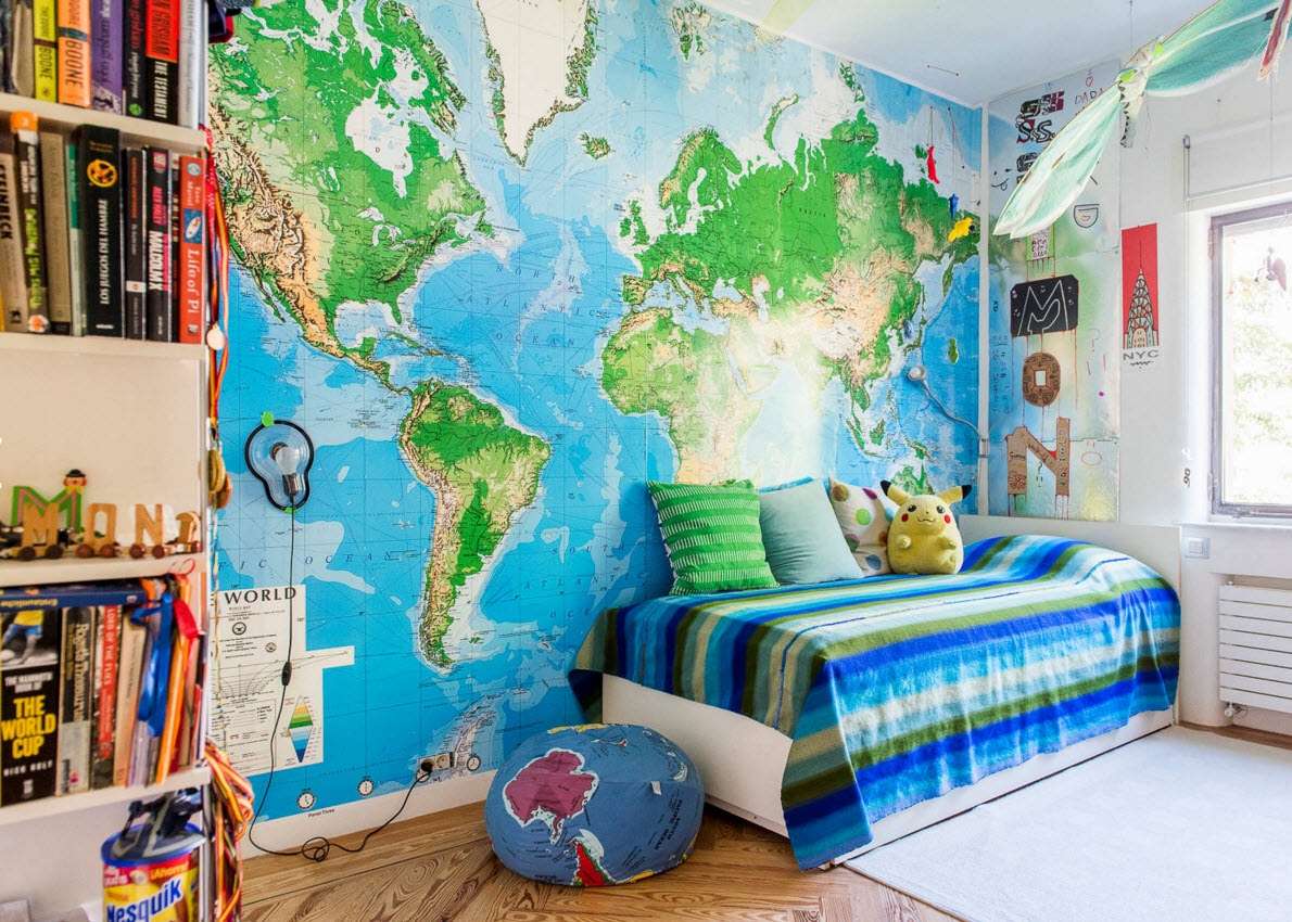 Если ребенок ходит в начальную школу, то непременно он интересуется природой и путешествиями. Почему бы в этом стиле и не оформить его комнату, как показано на фото.