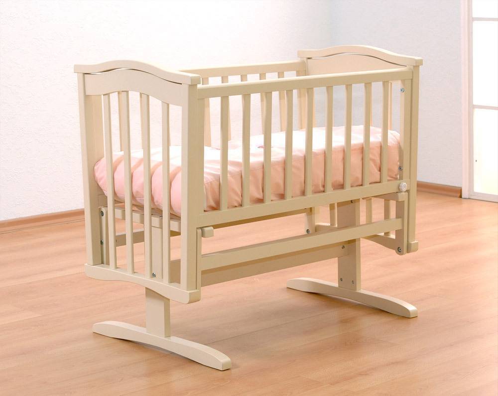 Самый бюджетный и экологически чистый вариант (если она покрывалась гипоаллергенным лаком или краской). Благодаря колесикам, её очень удобно перемещать по комнате, укачивая таким образом малыша. Кровать может быть оборудована ящиком внизу, подходящим для хранения постельного белья или игрушек. Размеры самого ложа (как правило, 120х60 см) позволяют спать в ней детям до достижения шестилетнего возраста.