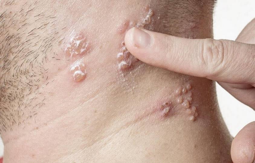 - Отёчность и гиперемия в зоне поражённого нерва (формируется на 3-й день после начала боли). Через 2-3 дня начинается появление пузырьков, наполненных прозрачной жидкостью и локализующихся группами.