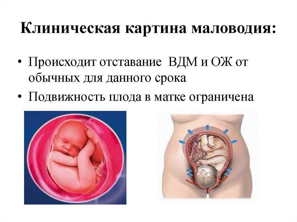- Маловодие – уменьшение объема околоплодных вод. Диагностируется на любом сроке эмбриогенеза при помощи УЗИ. Ассоциируется с повышенной перинатальной смертностью. Патология протекает бессимптомно, лишь некоторые женщины отмечают появление дискомфорта во время шевеления плода. При отсутствии нужного количества амниотической жидкости происходит задержка внутриутробного развития. Существует три степени тяжести. Определение вида заболевания позволяет устанавливать целесообразность сохранения беременности. Игнорирование проблемы приводит к рождению детей с недоразвитыми легкими, с искривленными ножками, с узкой грудной клеткой, атрезии пищеварительного тракта.