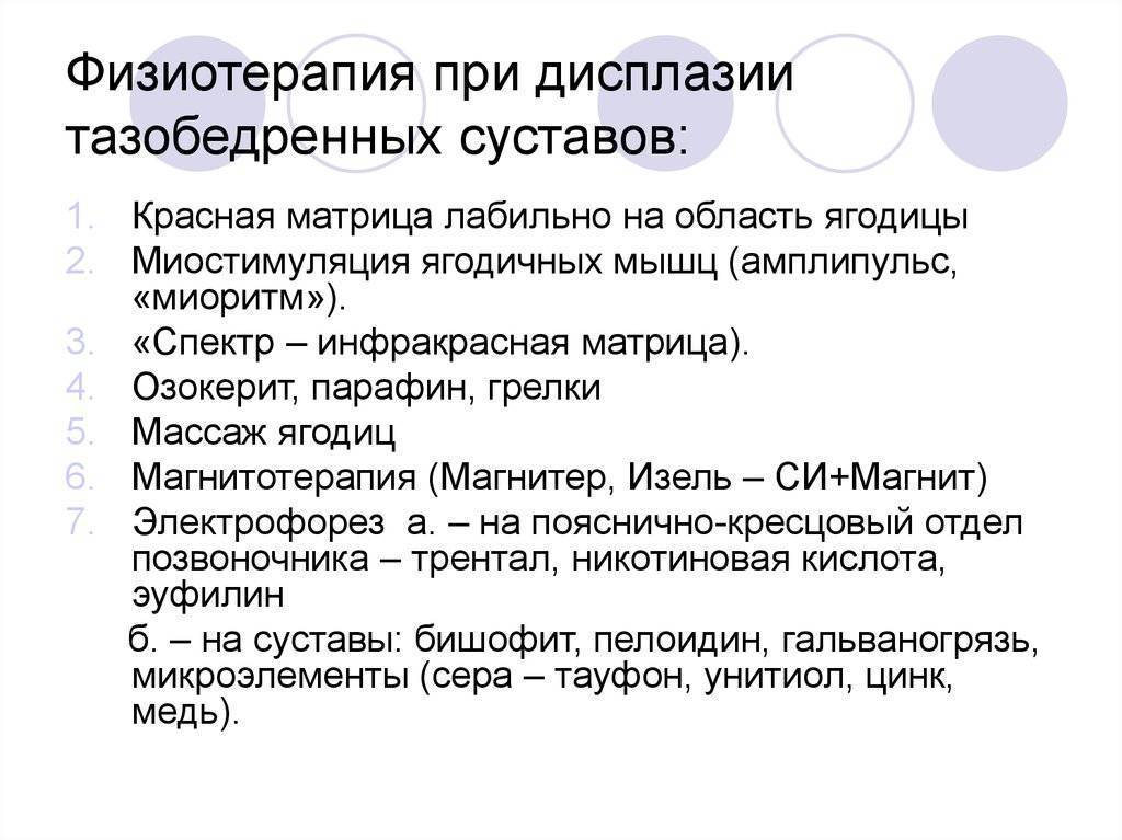 Все лечебные процедуры, которые могут помочь в предотвращении прогрессирования болезни, назначаются малышу, как можно раньше. Обычно уже при первом обращении к ортопеду, доктор может заподозрить наличие дисплазии. Назначения лекарственных средств требуется не при всех вариантах заболевания.