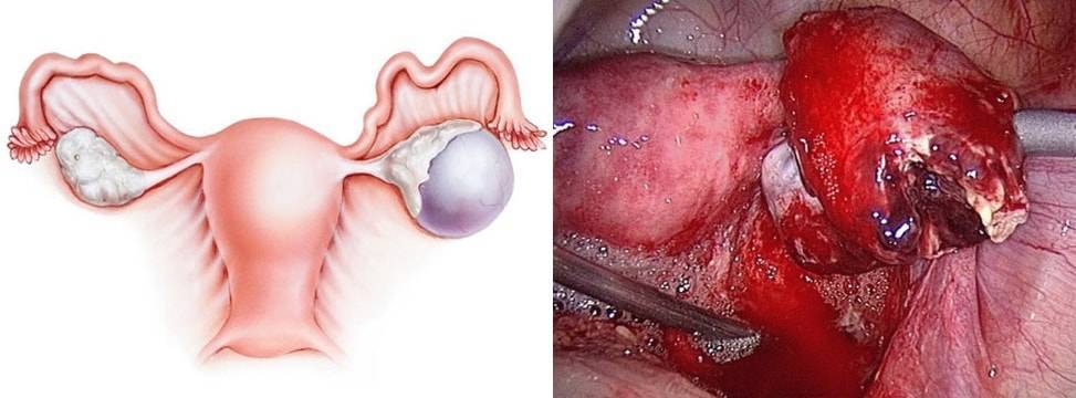 Когда врач выявляет кистозное новообразование в яичнике или развитие внематочной беременности, он назначает хирургическое вмешательство, устраняющее патологию.