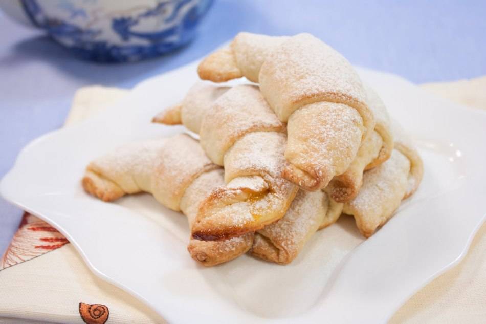 - В широкой части треугольника разложите начинку, скрутите трубочкой.