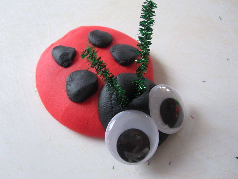 - Из черного пластилина делаются маленькие шарики для глаз, а из тонких жгутиков — усики. Затем они и прикрепляются к голове бабочки.