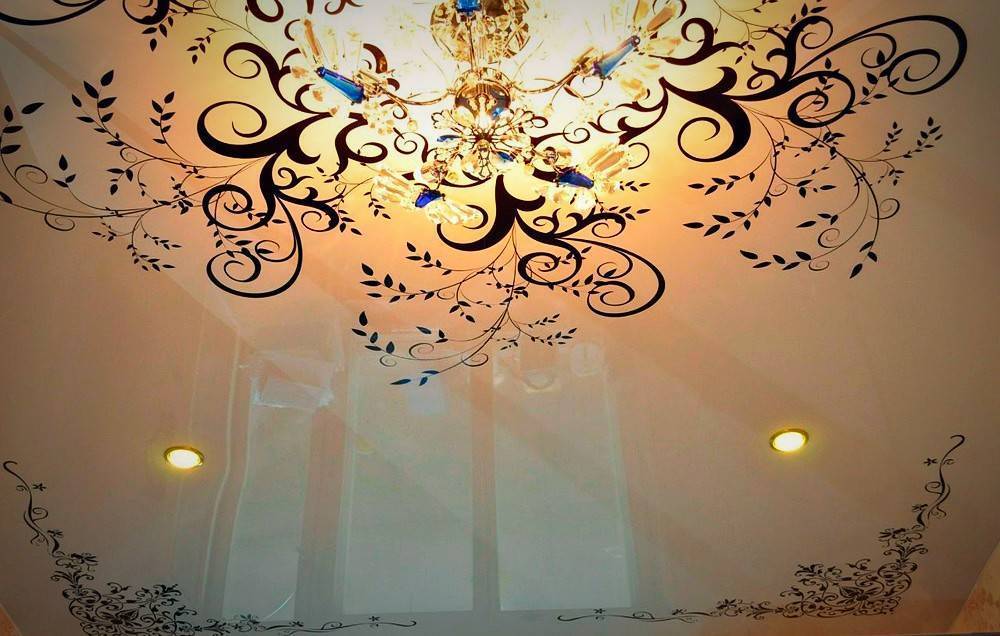 Менее распространённым, но более дорогим вариантом является узорный потолок. Его будет сложно сделать своими руками, поэтому рекомендуется прибегнуть к помощи опытных специалистов. Здесь популярны простые фигурки типа солнца, восьмёрки, цветка. Существует вариант с фотопечатью. Будьте очень аккуратны: существует очень тонкая грань между интересной картинкой и безвкусным изображением. Можно использовать рисунок облачного неба или изображения персонажей популярных мультфильмов.