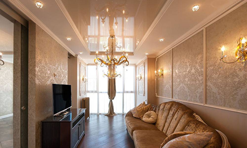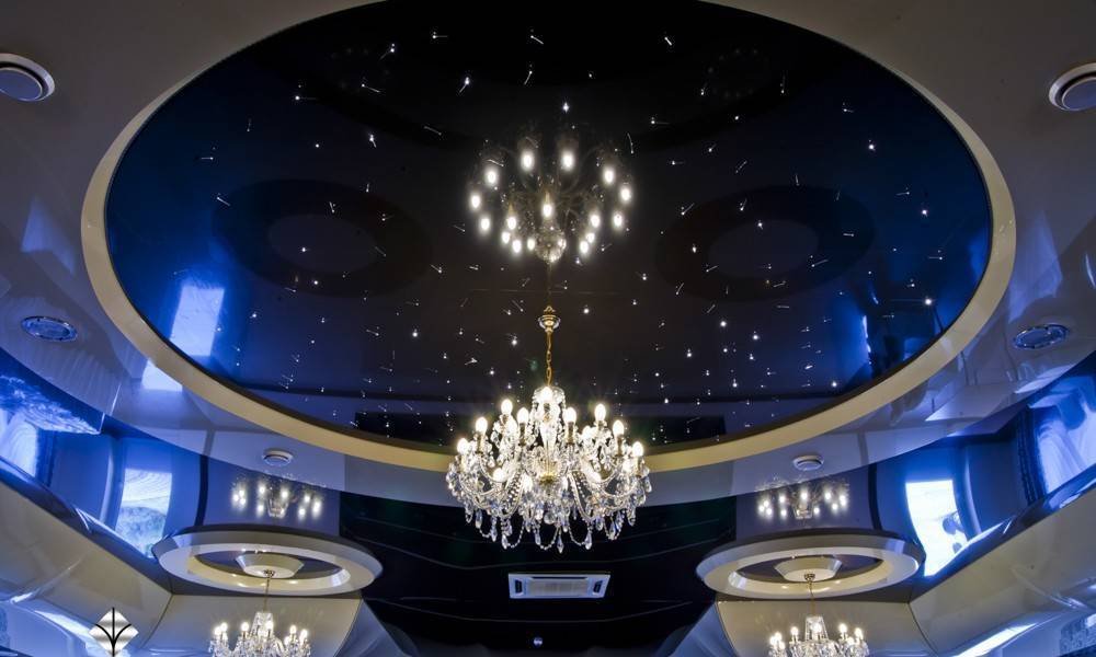 Люстра — центральный элемент. Обычно именно она является наиболее мощным источником света и главным украшением потолка, а иногда и помещения в целом. Отражаясь в зеркальной пленке, хрустальная люстра становится в два раза объемнее — это надо учитывать, чтобы не выбрать слишком громоздкую модель, если комната маленькая.