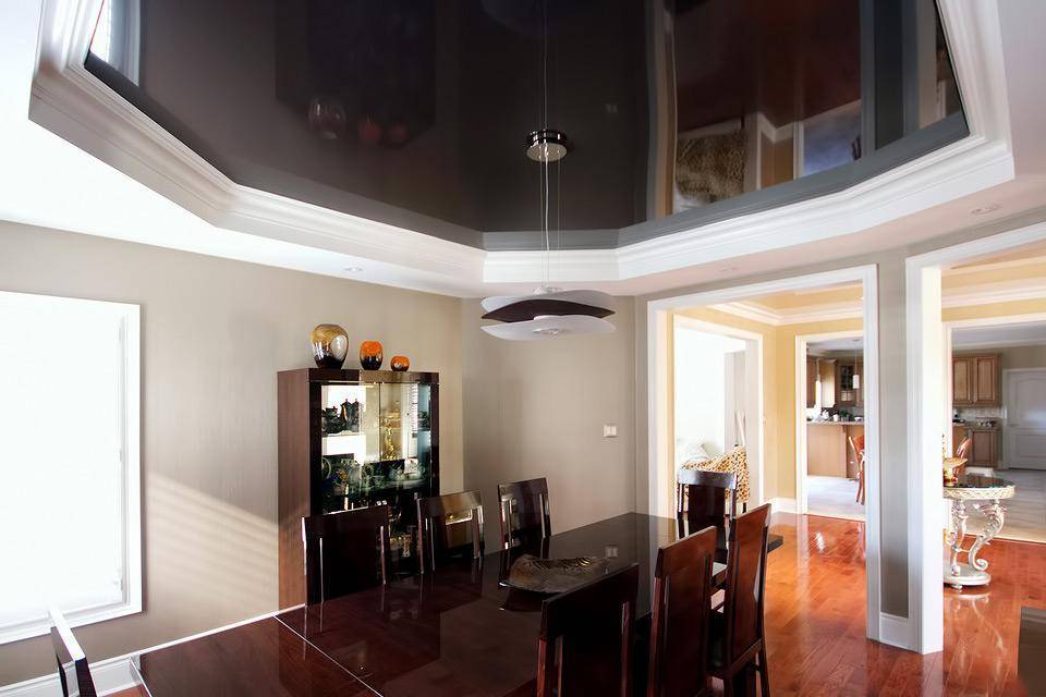 - черный натяжной потолок в зале – весьма эффектное решение. Глянцевый блеск пленочного полотна выполняет ту же функцию, что и при белом цвете, то есть обеспечивает отличное освещение и зрительно увеличивает комнату. При этом черный цвет не делает помещение мрачным, а наоборот придает ему необыкновенную элегантность. Фото черного натяжного потолка в зале могут служить примером интерьерной моды;