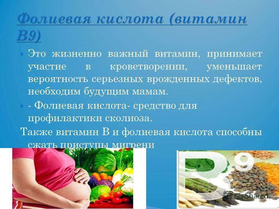 - До наступления беременности за 2-3 месяца и весь первый триместр необходимо принимать препараты, содержащие фолиевую кислоту. Она необходима для предупреждения аномалий развития нервной трубки плода.