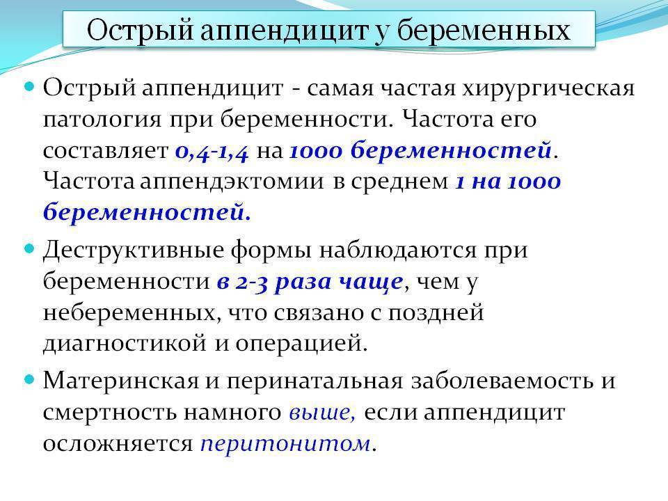 Острое воспаление аппендикса развивается всего у 0,5-4% беременных. Часто причина заболевания кроется в действии эстрогена на лимфатические ткани отростка прямой кишки. Возможно его раздражение растущей маткой.