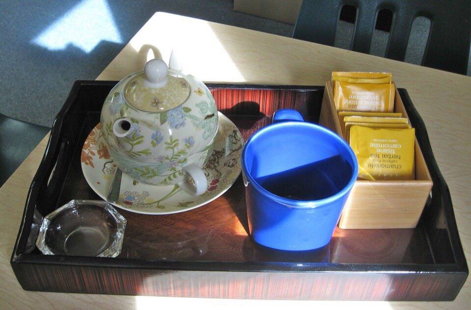 Завтрак. — Оладьи с джемом, бутерброд и чай с лимоном.