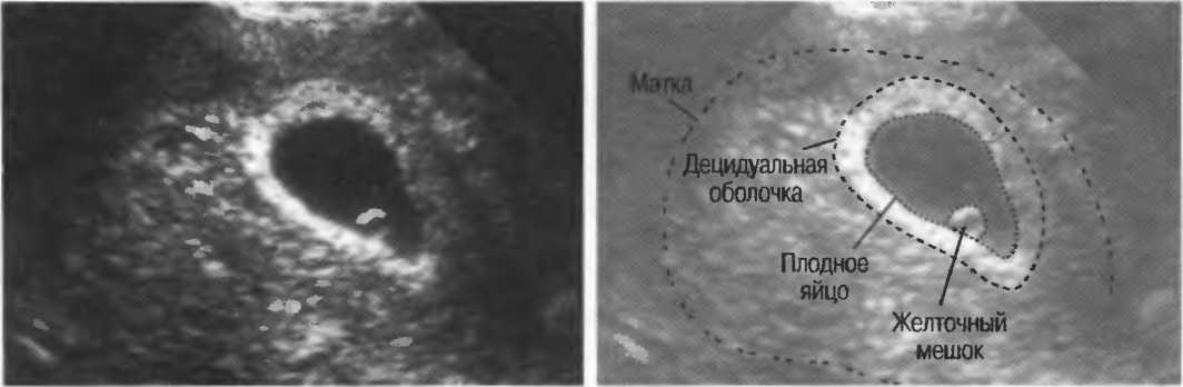 - пустая полость амниона (без желточного мешка и эмбриона) при 6-недельной беременности.