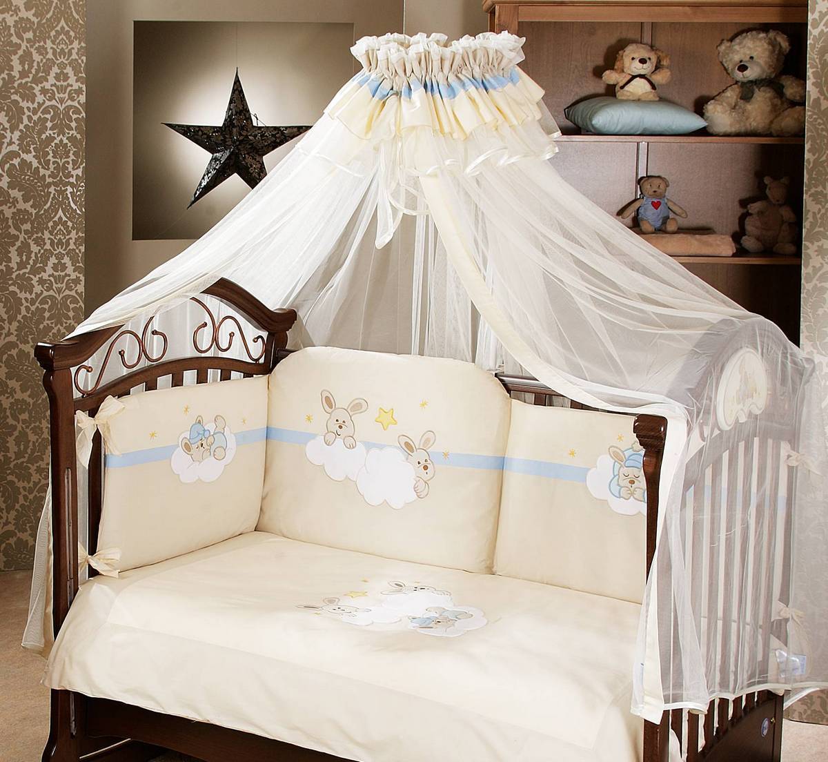 - Нежный бежевый станет отличным вариантов как для малька, так и для девочки. Такие комплекты под торговой маркой «Сонный гномик» довольно популярны. В наборе — 7 предметов. Предметы пошиты из сатина, а балдахин – сетчатый. Стоимость в среднем 7500 рублей.