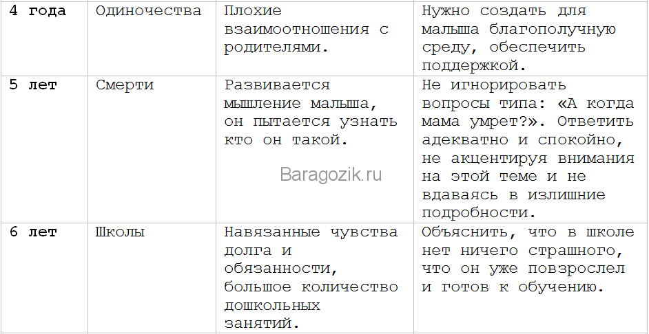 Это чаще проявление бурной фантазии. Это время “расцвета” разных страхов, когда ребенок может буквально начать бояться всего: темноты, природных стихий, сказочных героев, животных, бандитов и войн. Эти боязни связаны с глубинным страхом смерти — своей и родителей. Причиной может стать конкретная ситуация (укус собаки, например, или переезд), запугивания взрослых (“придет серенький волчок и укусит за бочок”), внушения (“не входи — убьёт”).