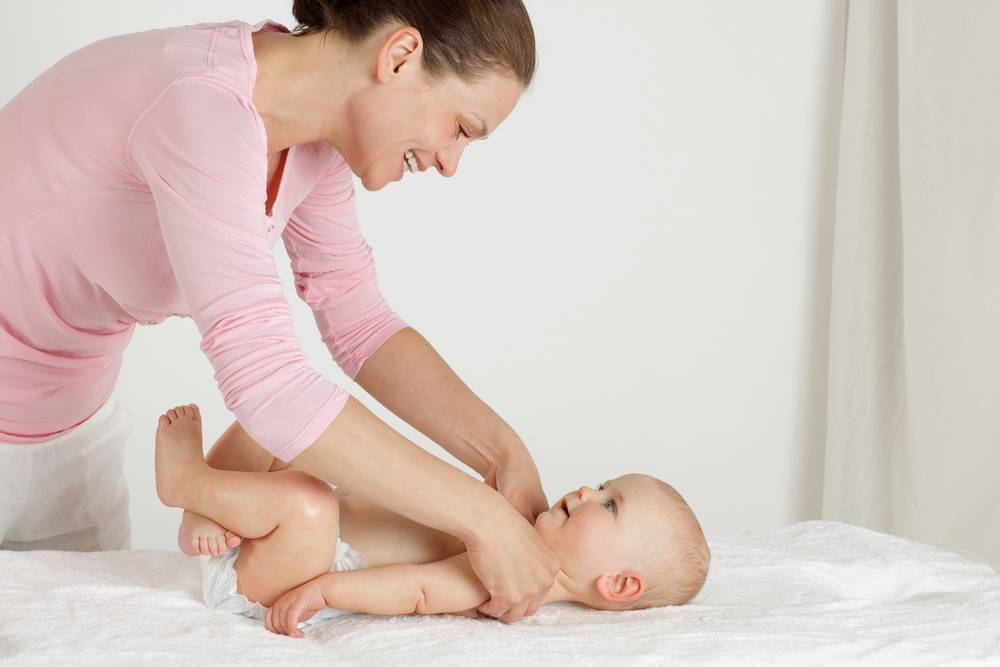 - После проведения упражнений нужно провести массаж. Делают растирания в области живота по часовой стрелке, затем растирают руки и ножки. Выкладывают младенца на живот, поглаживают спинку.