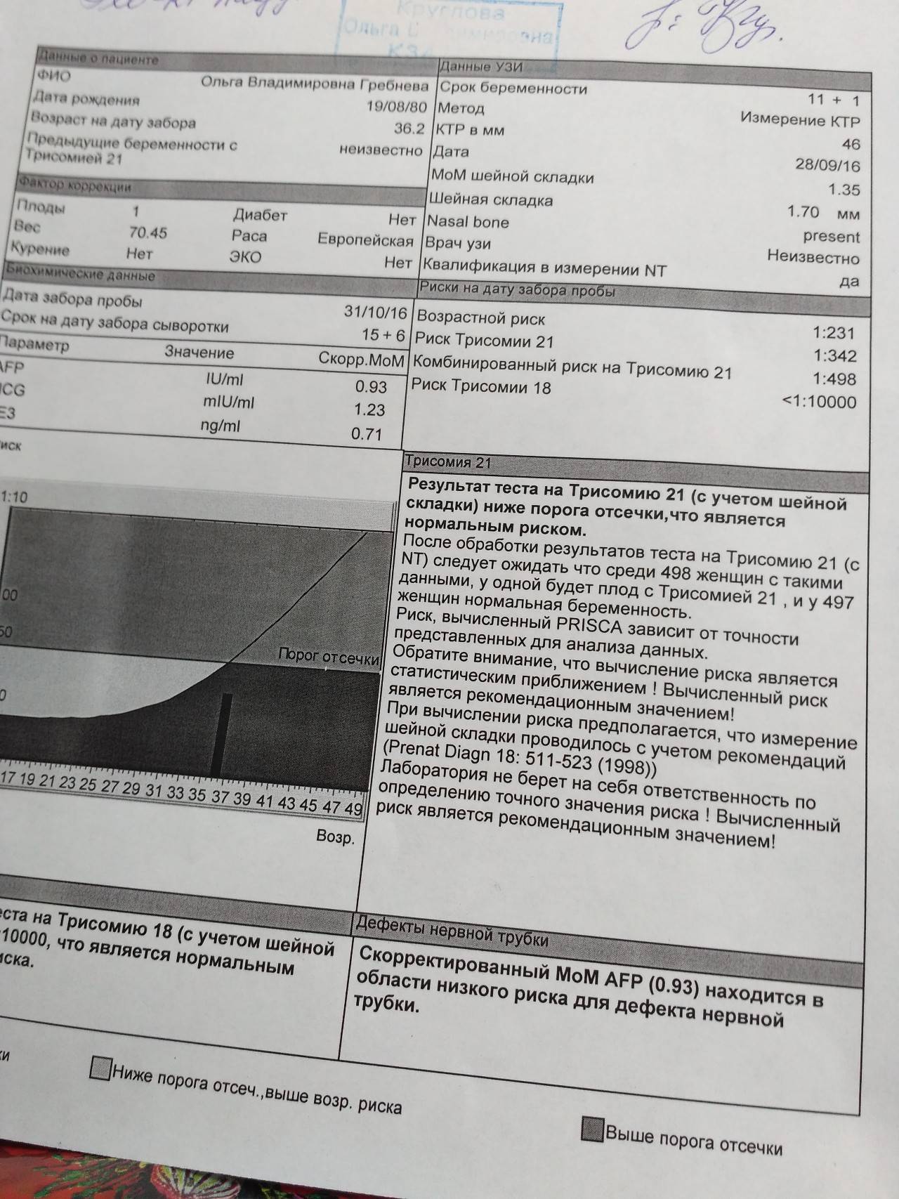 Спасибо. Но хочу еще уточнить, была в области у генетика, она сказала что всё ещё риск пограничный, так как по возрасту у меня 1: 231, а граница 1: 250. сказали сделать УЗИ в 20 нед и если что не так, то приезжать. Так все таки на какой риск ориентиповаться из трех цифр? Спасибо ещё раз.