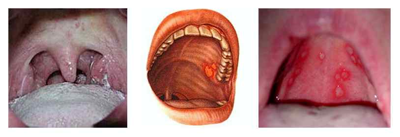 Протекает с подъемом температуры, появлением болевых ощущений в области глотки, лимфаденопатией, покраснением зева, везикулярными высыпаниями и язвами в области зева и глотки.