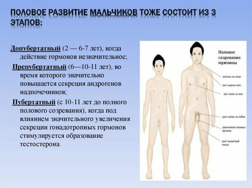 Гормональное созревание у мальчиков, или становление половой функции, проходит этапы новорожденности, допубертатный, подростковый (пубертат) и зрелости.